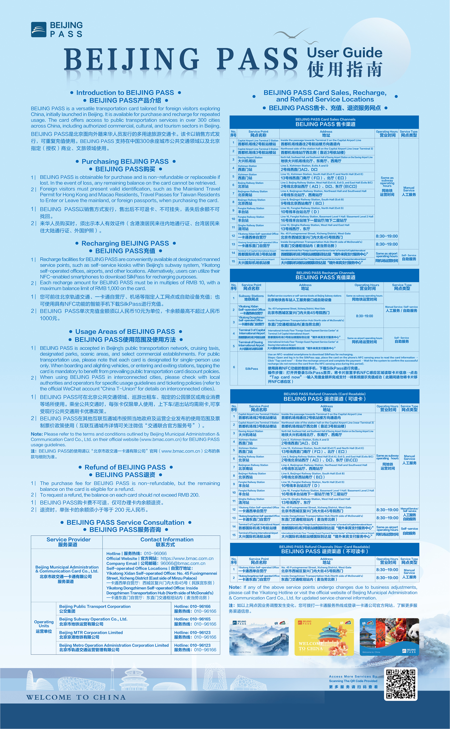 BEIJING PASS購卡費不可退,僅可辦理卡內(nèi)余額退資。退資時,單張卡的余額須小于等于200元人民幣。