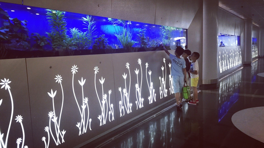 T2連廊口設置了集“水族觀賞、合影留念、投影互動”于一體的T2“海底世界”景觀走廊,新加入的投影互動系統(tǒng),將T2“海底世界”的動態(tài)影像投影于地面,在紅外系統(tǒng)的監(jiān)控下,旅客腳步踩過“水面”,游魚會“匆匆”游走,不經意間的高科技互動體驗,為旅客帶來了意外的歡樂。