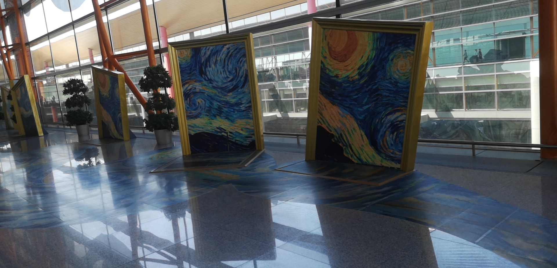 星空長廊以星空為主題,玻璃幕墻上有高為5.2米的星月夜圖案,沿途地面鋪設星月夜地貼,設置了六處動物造型綠植,有兔子、小熊、大象、麋鹿等動物造型,共計70米長。